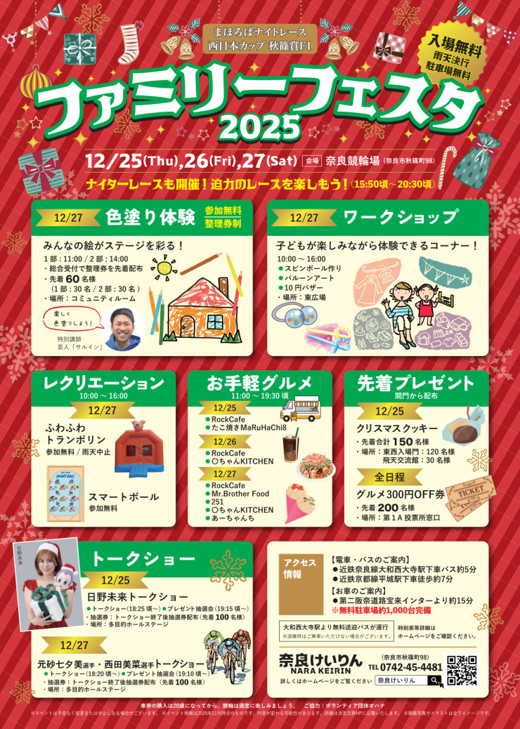 2025.12.11 西日本カップ 秋篠賞 ファミリーフェスタ★ 27日のトークショー出演者 元砂七夕美選手・西田美菜選手 に決定しました。 ファミリーフェスタ(PDFファイル:1.57MB) PDFファイルをご覧いただくためには Adobe Reader(アドビ・リーダー)が必要です。左のバナーからダウンロードできます。