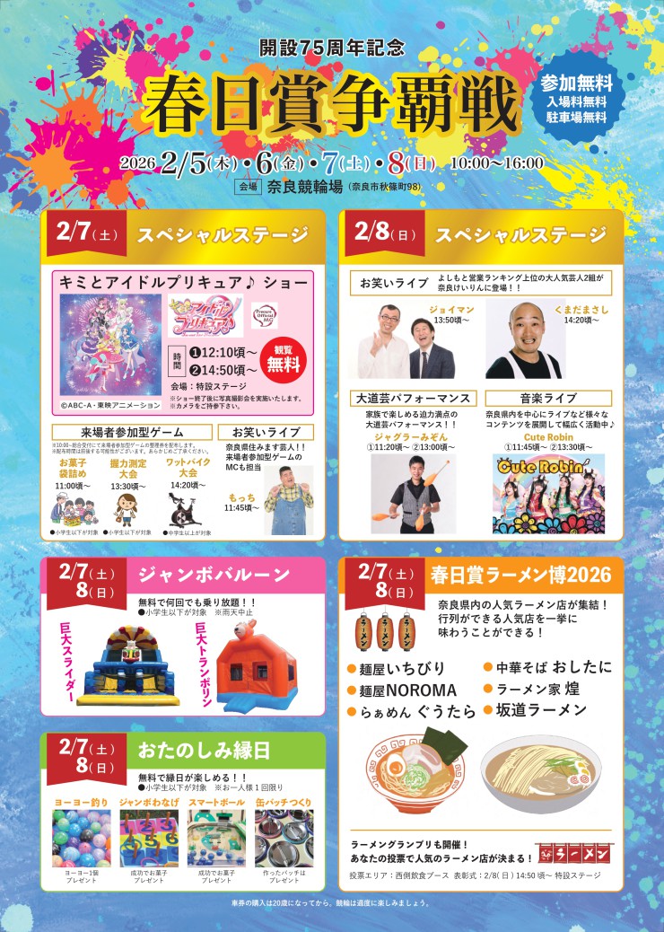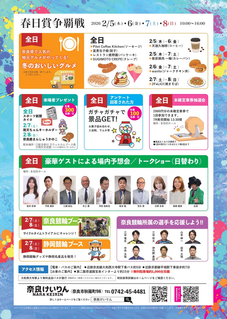 2026.01.16 【場内イベント】2026年2月春日賞争覇戦NEW 春日賞特設ページはこちら イベント内容は事情により、予告なく変更となる場合がございます。ご了承ください。 春日賞争覇戦2026(PDFファイル:5.17MB) PDFファイルをご覧いただくためには Adobe Reader(アドビ・リーダー)が必要です。左のバナーからダウンロードできます。