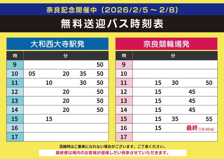 2026.01.20 【2/5~2/8】開設75周年記念「春日賞争覇戦」 開催における無料送迎バスの運行についてNEW 奈良競輪開設75周年記念「春日賞争覇戦」[G3]開催中における無料送迎バス運行時刻について 開催期間中[2026年2月5日(木)~2月8日(日)]は以下のとおり運行させていただきます
