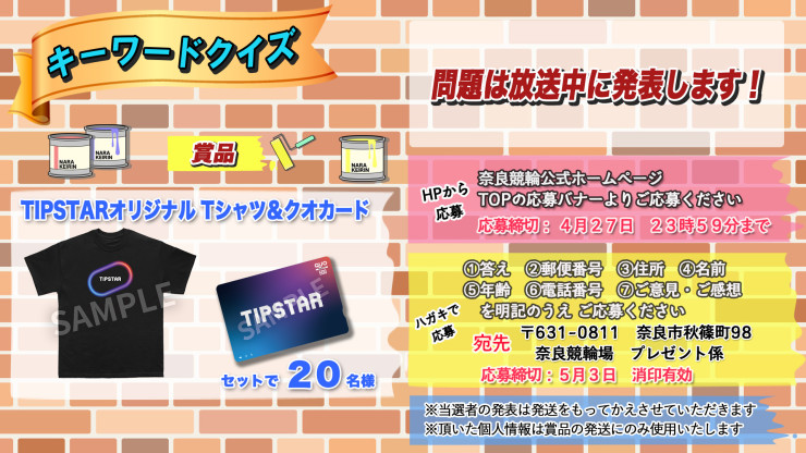 2026.04.24 ミッドナイト開催のお知らせ【4/25~4/27】NEW 【開催日程】2026年4月25日(土)~4月27日(月) 【タイトル】仲間と繋がるTIPSTAR杯 【CS放送】 ・放送 :693ch ・放送時間:20:03~23:40 【出演者】 ・MC:大津 尚之 ・解説:中川 武志 ・実況:滝口 久 【CS放送プレゼント】 【応募はこちらから】 応募期間:2026年4月25日(土)20時00分 ~ 4月27日(月)23時59分